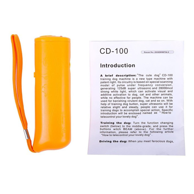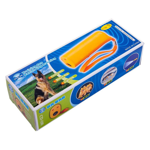Ультразвуковой отпугиватель собак CD-100 - это карманный электронный прибор для защиты от нападения агрессивных собак. Дальность действия - 10 метров. Работает от батарейки (крона). Имеет 3 режима работы - режим отпугивания агрессивных собак, режим дрессировки и режим фонарика.