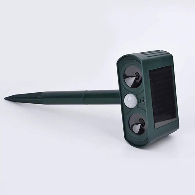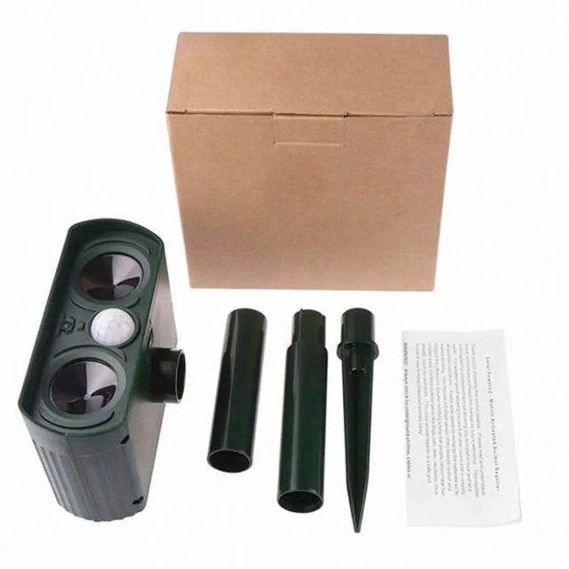 Стационарный отпугиватель собак и котов на солнечной батарее Garden Protector надежно защитит от собак, кошек, грызунов, белок, куниц и и других животных участок до 84 квадратных метров. Имеет встроенный датчик движения с дальностью действия 10 метров и углом охвата 110 градусов. Влагозащищенный корпус пластиковый корпус. Работает от солнечной батареи днем и от встроенного аккумулятора ночью. Мигающие во время работы светодиоды оказывают дополнительный отпугивающий эффект.