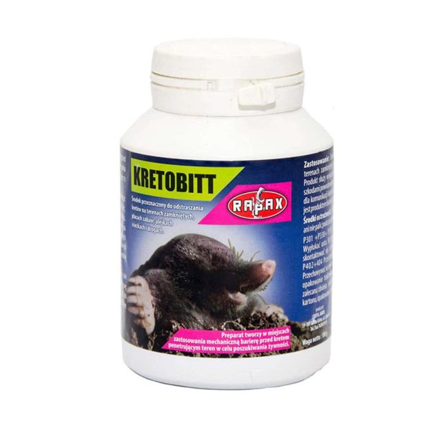 Cредство от кротов в гранулах KRETOBIT Rapax эффективное средство от кротов и слепышей на дачном участке, огороде, газоне, клумбе и других местах. Средство против кротов KRETOBIT от польского производителе Rapax это не классическое средство от кротов, поэтому не убивает кротов, а только отпугивает их с помощью сочетания натуральных ароматизаторов и касторового масла без использования химии и ядов поэтому безвредно для растений и земляных червей.