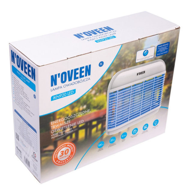 Электрический уничтожитель насекомых Noveen IKN920 LED полностью безопасен для людей и животных, излучает свет со специальной длиной волны, эффективно привлекающей летающих насекомых без использования химических веществ или других вредных веществ. Насекомые, после заманивания, погибают в сетке перед источником света с напряжением 2500 Вт. Мертвые насекомые попадают в специальный выдвижной лоток и легко оттуда убираются.