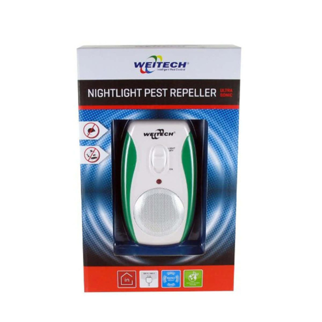 Ультразвуковой отпугиватель мышей и насекомых с ночником Weitech WK0190 эффективен против мышей, крыс, тараканов, пауков, клопов. Безопасен для человека и домашних животных. Абсолютно беззвучен, идеален для жилых помещений. Площадь действия 90 квадратных метров. Имеет функцию ночника и отличается мизерным энергопотреблением (0,8 Вт)