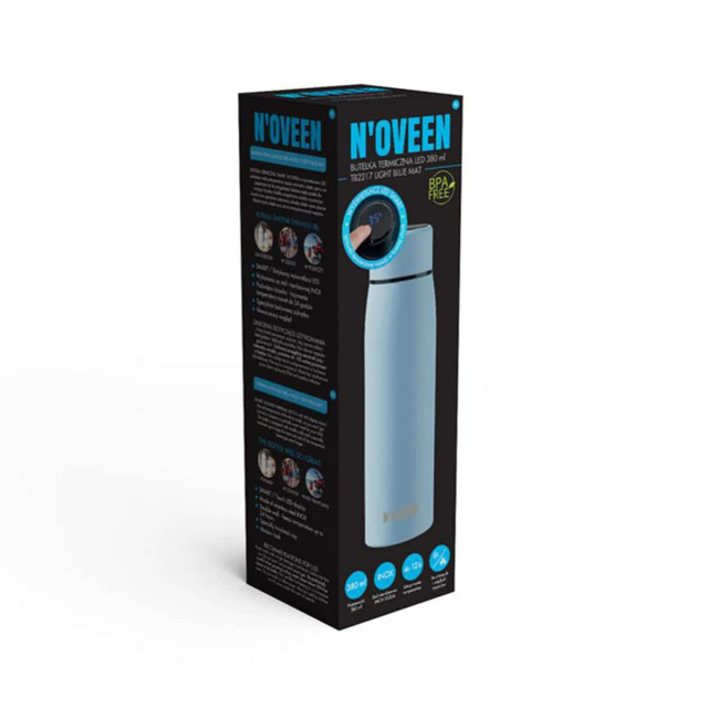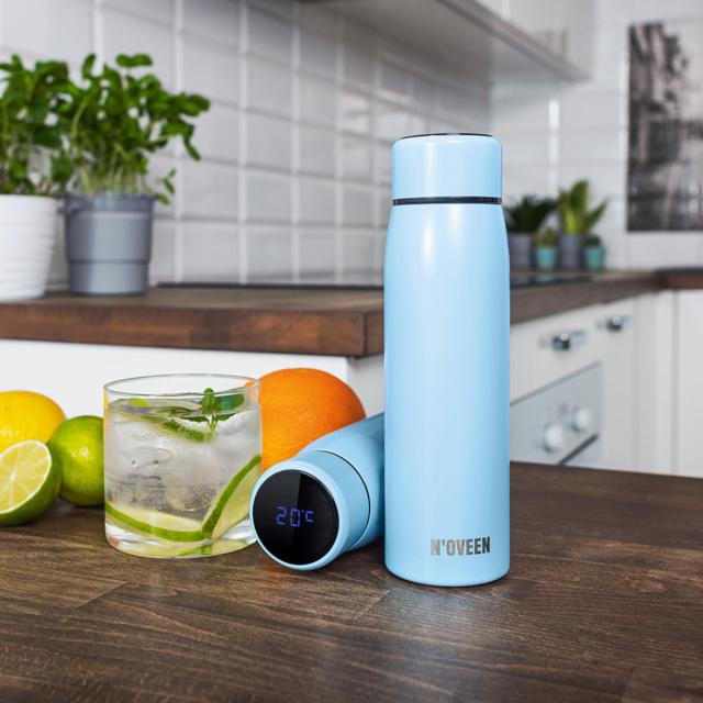Термобутылка с дисплеем Noveen TB2217 Smart сделана из нержавеющей стали INOX SS304 и пластика BPA free (материалы, лишенные бисфенола А) и идеально подходит для работы, учебы, путешествий, спорта, т.к. в ней можно хранить и транспортировать как холодные, так и горячие напитки. Двойные стенки и специальная изолированная крышка держат температуру в термосе бутылке до 24 часов. Сенсорный светодиодный дисплей показывает температуру напитка внутри термобутылки.