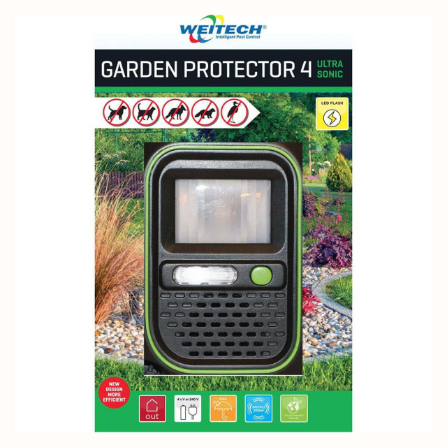 - Широкий радиус действия. Отпугиватель Weitech WK-0054 Garden Protector 2 способен полностью защитить от животных участок площадью до 200 квадратных метров! Как показывает практика, этого более чем достаточно, чтобы защитить от бездомных собак и кошек подъезд, частный дом, сад, огород и т.п.