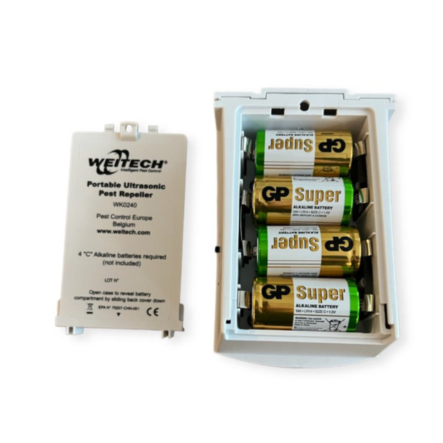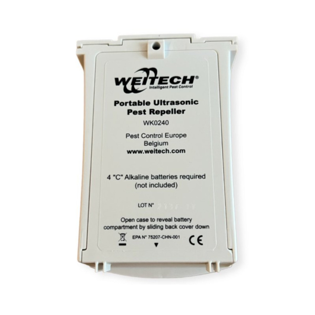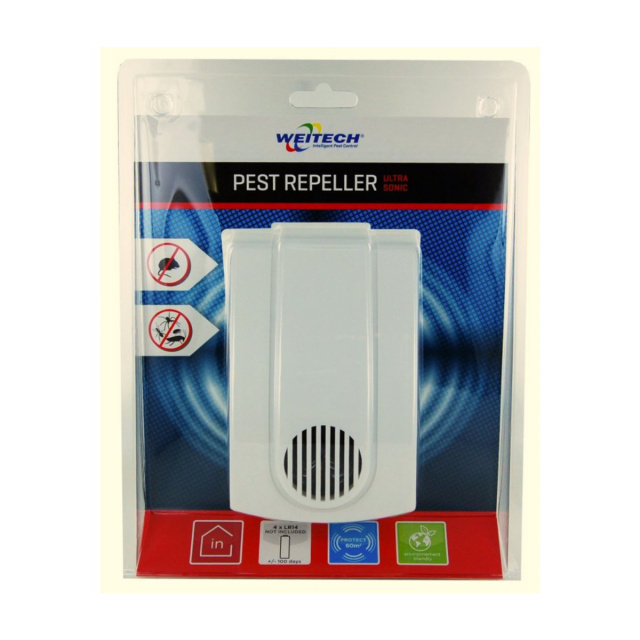 Ультразвуковой отпугиватель мышей крыс насекомых на батарейках Weitech WK-0240 - это универсальный портативный отпугиватель мышей, крыс, тараканов, пауков, моли и других насекомых. Абсолютно безвреден для человека и домашних животных, поэтому может применяться как в жилых, так и в производственных помещениях. Работает от 4-х батареек типа С и имеет площадь действия до 60 квадратных метров.