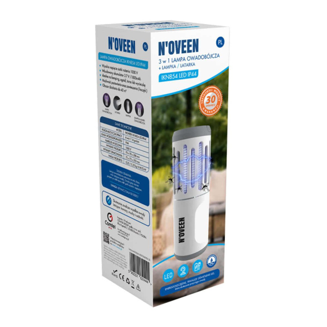 Фонарь от комаров мух насекомых аккумуляторный Noveen IKN854 LED IP44 работает в 3-х режимах: фонарь, лампа и/или уничтожитель насекомых. Площадь действия - 40 квадратных метров. Работает до 14 часов от встроенного аккумулятора, который заряжается от USB. Водонепроницаемость IP44.