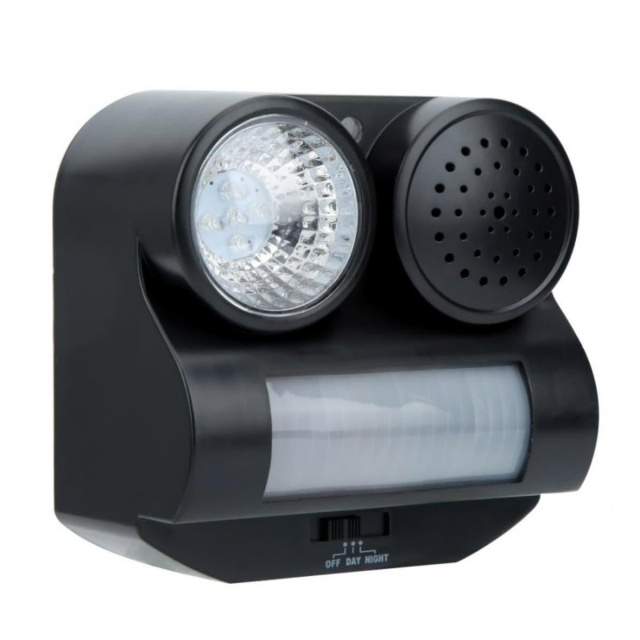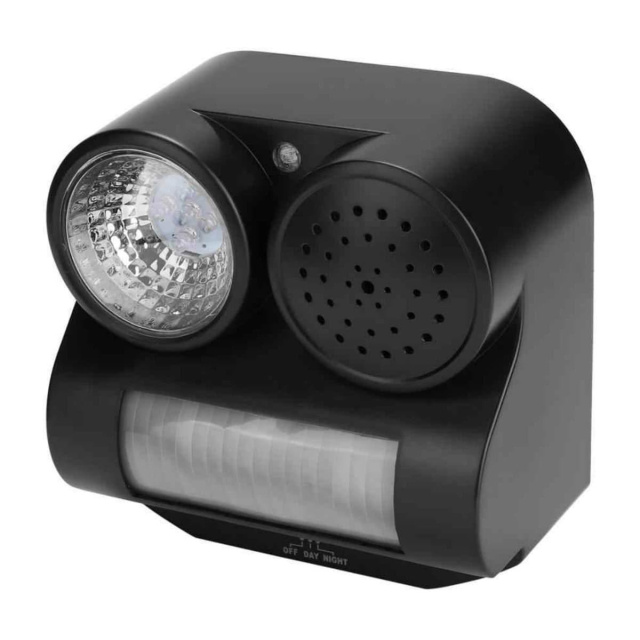 Благодаря встроенному датчику движения звуковой отпугиватель птиц работает только тогда, когда это необходимо. При обнаружении движения, устройство излучает звуки выстрелов + световые вспышки или световые вспышки, в зависимости от режима работы (день или ночь).