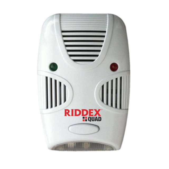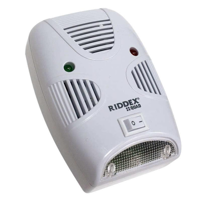 Комбинированный отпугиватель грызунов и насекомых Riddex Quad – это безопасный прибор против мышей, крыс, тараканов, муравьев, клопов, работа которого основана на использовании электромагнитных и ультразвуковых волн, которые и отпугивают вредителей незаметно для человека. Данный электромагнитный отпугиватель мышей может использоваться в любых закрытых помещениях (квартирах, домах, гаражах и т.д.).