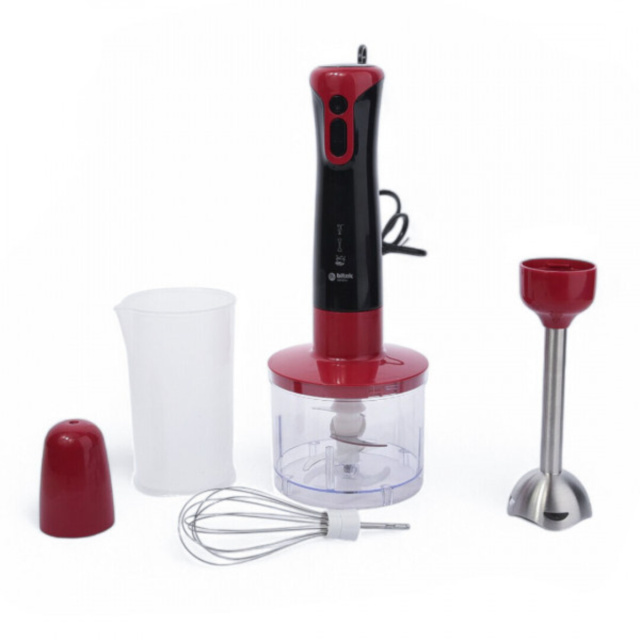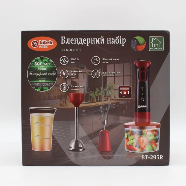Погружной блендер BITEK BT-293R 4 в 1 - это продуманное решение для тех, кто хочет готовить с комфортом. Модель объединяет функции блендера, венчика, измельчителя и чаши для смешивания, позволяя заменить сразу несколько кухонных приборов. Благодаря высокой мощности в 1800 Вт, он справляется даже с самыми твердыми продуктами: орехами, замороженными фруктами, овощами, мясом и даже льдом.
