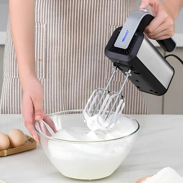 Съемные насадки из нержавеющей стали легко моются, а кнопка отсоединения делает процесс смены максимально простым. Миксер устойчиво стоит благодаря нескользящим ножкам и отличается надежной работой, что делает его подходящим как для ежедневного использования, так и для особых случаев.