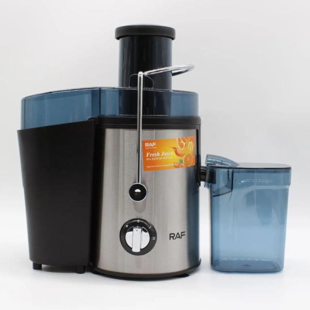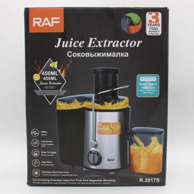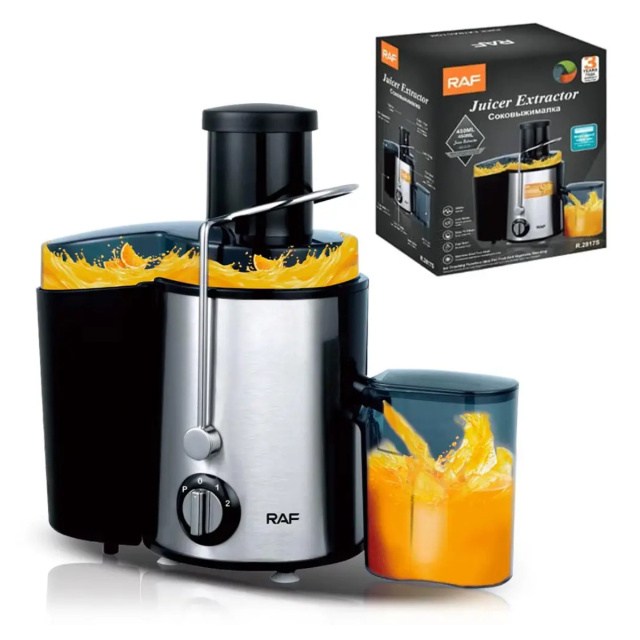 Электрическая соковыжималка для цитрусовых фруктов овощей RAF R2817S 1000 Вт - это мощное и надежное устройство для ежедневного приготовления свежих и полезных напитков. Благодаря мотору мощностью 1000 Вт электрическая соковыжималка RAF R2817S с лёгкостью справляется даже с твёрдыми овощами и фруктами, извлекая максимум сока за короткое время. Простая в управлении, с двумя режимами скорости, соковыжималка позволяет выбрать оптимальные условия для различных продуктов: мягких и твердых.
