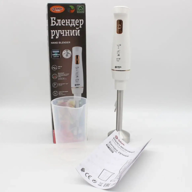 Ручной погружной блендер кухонный с чашей 600 мл Bitek BT-313B создан для тех, кто ценит скорость, удобство и качество на кухне. С его помощью вы сможете измельчать, взбивать и смешивать продукты любой сложности - от мягких фруктов до орехов и льда. Мощный двигатель на 1600 Вт обеспечивает стабильную работу и позволяет добиваться идеальной текстуры блюд всего за несколько секунд.