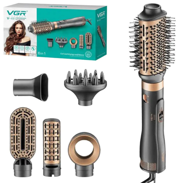 Фен расческа стайлер для укладки волос с 6 насадками VGR V-491 - это современный многофункциональный стайлер для волос, который позволяет легко создавать профессиональные укладки в домашних условиях. Модель сочетает в себе функции фена, щетки и плойки, что делает её универсальным решением для сушки, завивки и выпрямления волос.