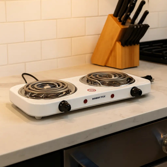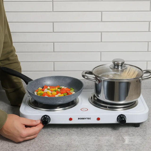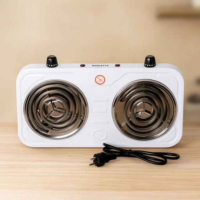 Электроплита настольная спиральная на 2 конфорки BobbyTec HP-03D 2000 Вт - это удобное и компактное устройство, созданное для быстрого и эффективного приготовления пищи в любых условиях. Одна конфорка диаметром 150 мм и мощность 1000 Вт обеспечивают равномерный нагрев, позволяя легко готовить супы, гарниры, жарить или разогревать блюда.